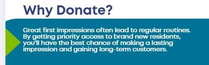 We need local businesses to contribute an experience, product, service, pass, membership, or credit that fits within The Welcome Package or one of the six curated incentive packages, with a value of up to $500 per household.